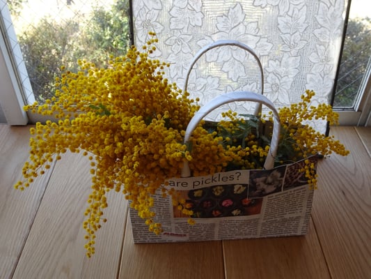 毎日ミモザを切って一枝づついらした方に差し上げています。