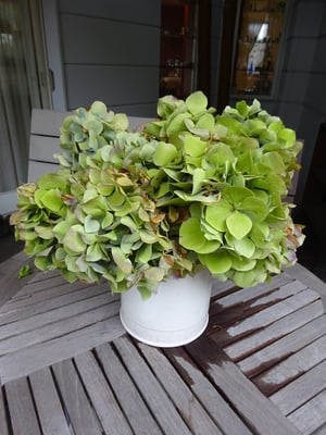 毎年青紫の大きな花を咲かせる紫陽花は緑に