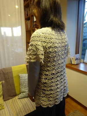 かぎ針であんだ模様編みのベストは首回りから丸く編んで行きます。
