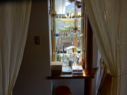 窓に設けたガラスの棚に並べた小さなコレクションを
