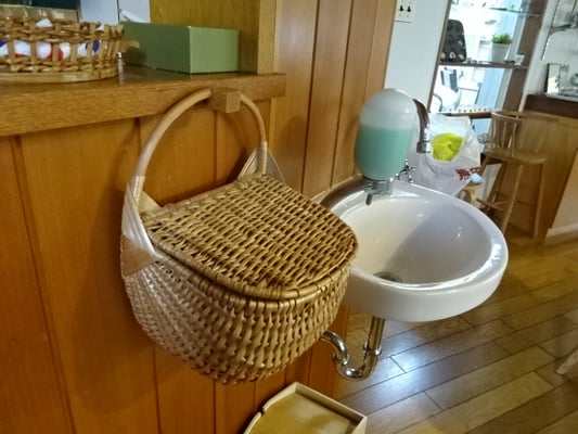 ラトビアで買ってきたカゴを手洗い器の横に