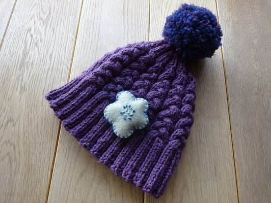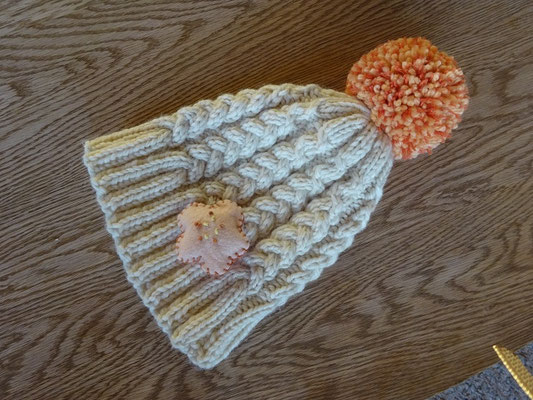 孫に編んだ帽子にリクエストに応えてお花を付けました。