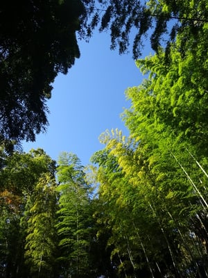 竹林を散歩して上を見上げると青空と竹の緑