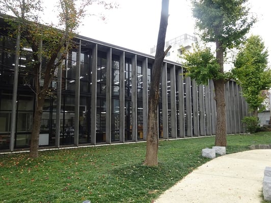 神奈川県立図書館の裏庭から見た図書館はモダンで
