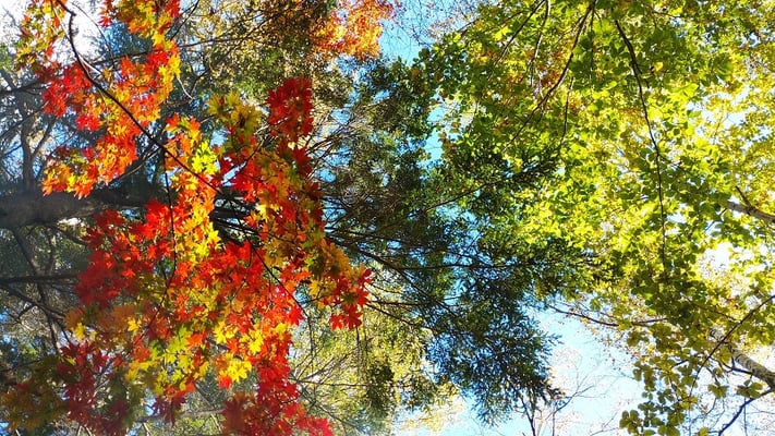 林の中で上を見上げると赤や緑や黄色の