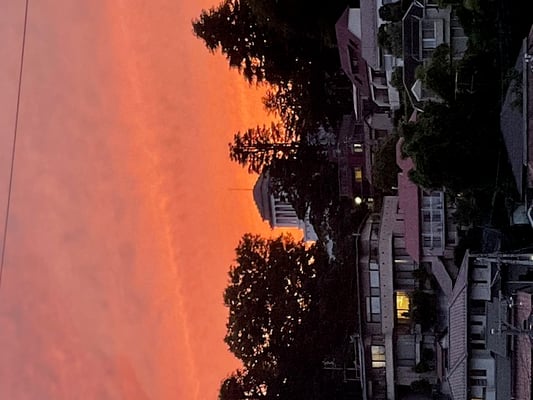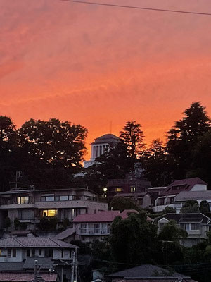 記念館の上辺りの空が燃えるように赤くなっていました。