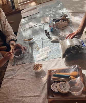 楽しくハーブを混ぜ小さな靴下に詰めて