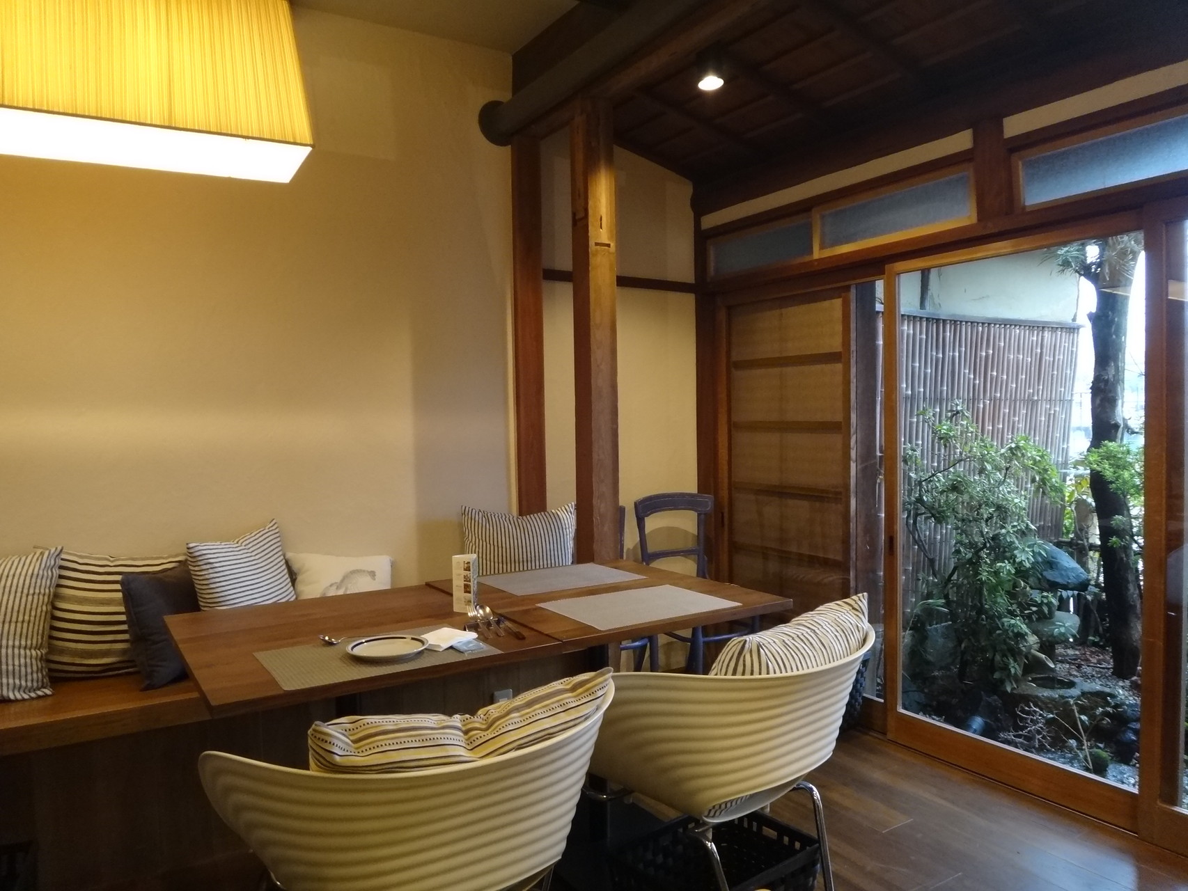 路地の突き当たりは町屋を改装してイタリアンのお店になっていました。 細長い店の奥はデッキになっていて鴨川が望めました。 5月1日から9月30日まで「鴨川納涼床」のイベントでデッキが広がり 外で食事が出来るそうです。