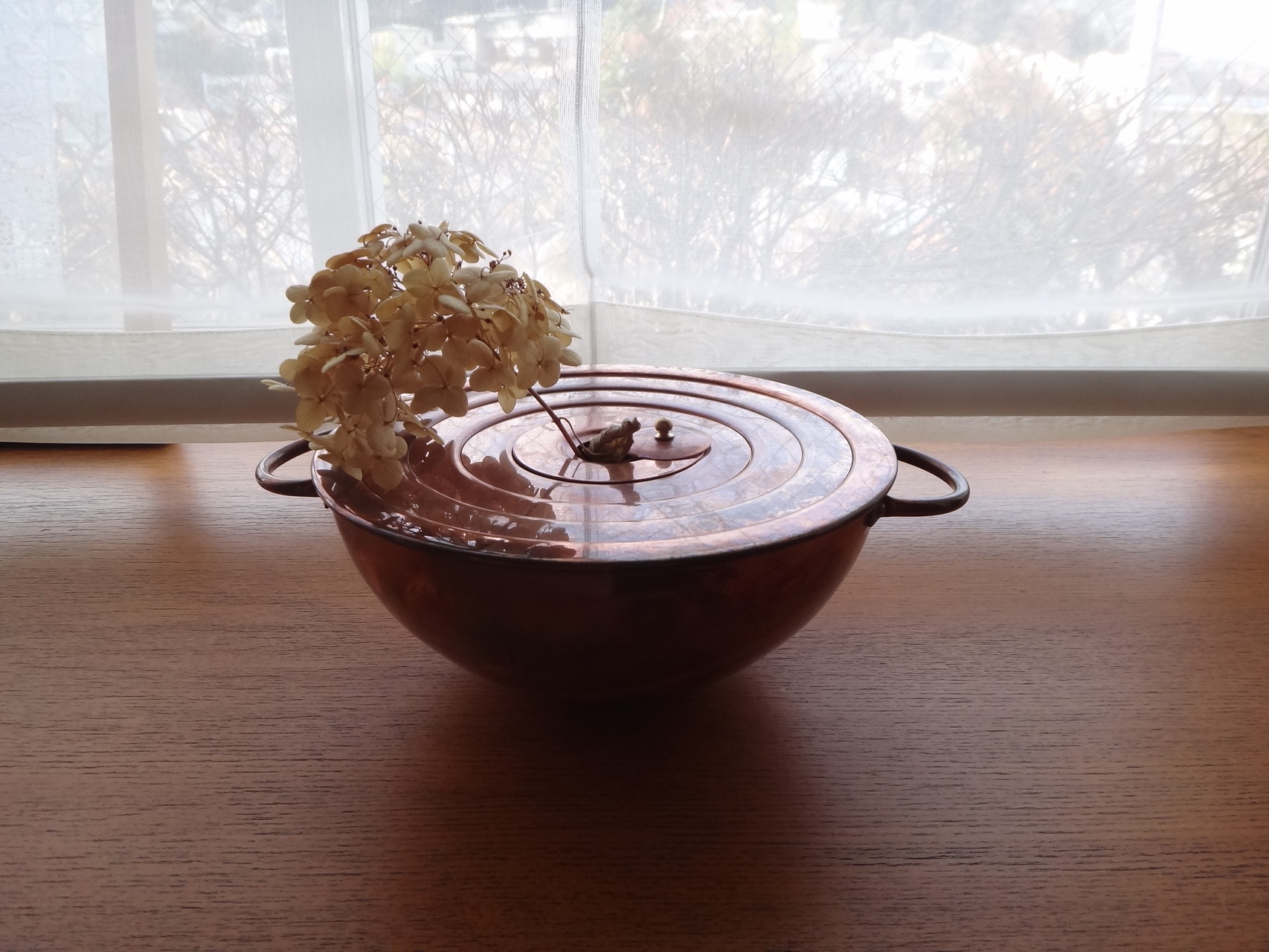 京都のアンティークショップで見つけたなべは不思議な形です。 銅製の小ぶりの鍋でふたが5つに分かれています。 これは理科実験用に湯せんする為の鍋で試験管やビーカーなど 大きさに合わせて蓋を選ぶそうです。