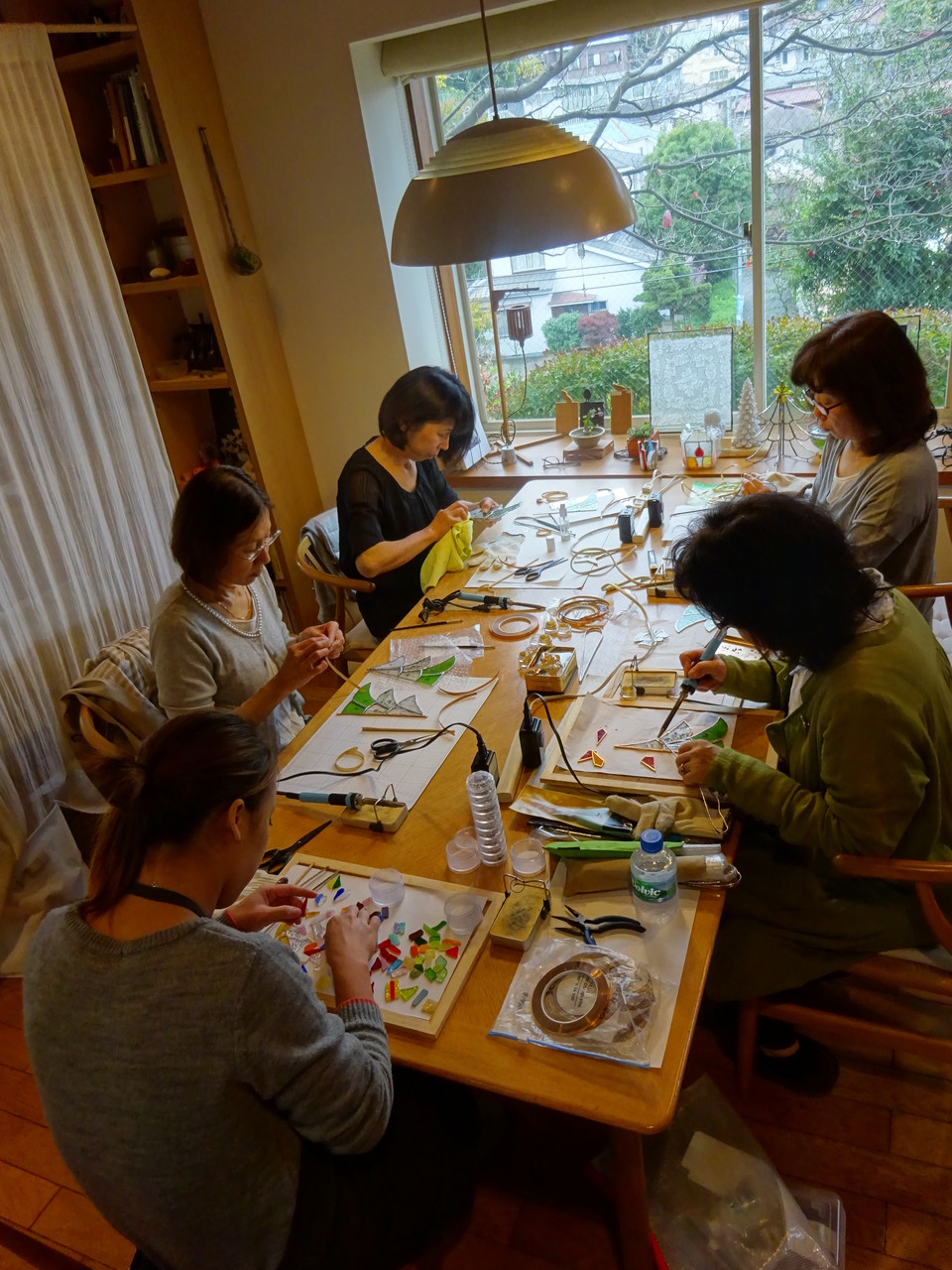 今年最後のステンドグラスワークショップが開催されました。 今回は前回の続きでリースを作られる方・サンキャッチャー・アクセサリーを作られる方達が素敵な作品を完成されました。