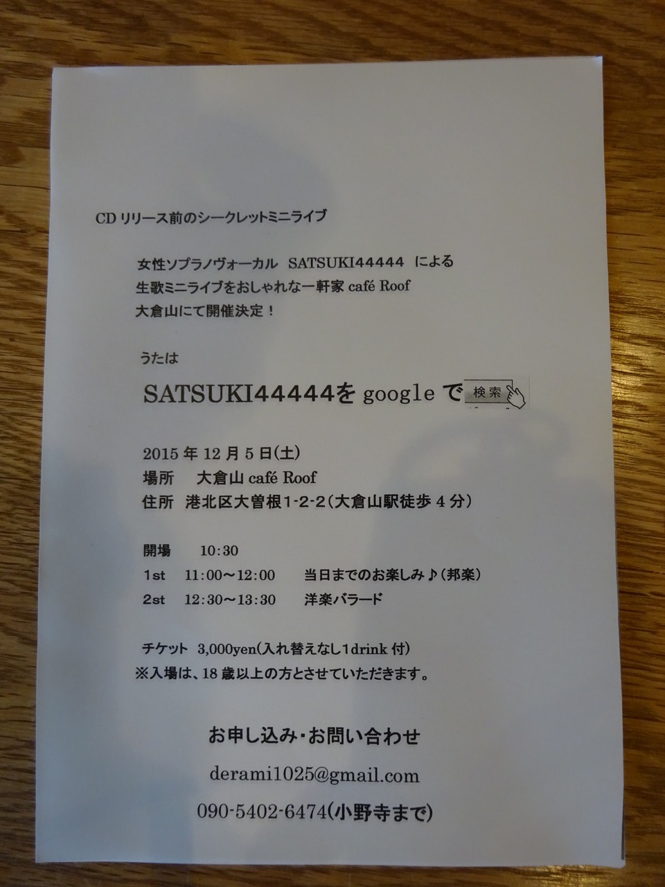 女性ソプラノボーカリスト SATSUKI44444 による ミニライブが12月5日(土)11時~13時半開催されます。 1ドリンク付き 3000円 当日は11時~15時まで貸し切りになります。(デッキ席は除く)