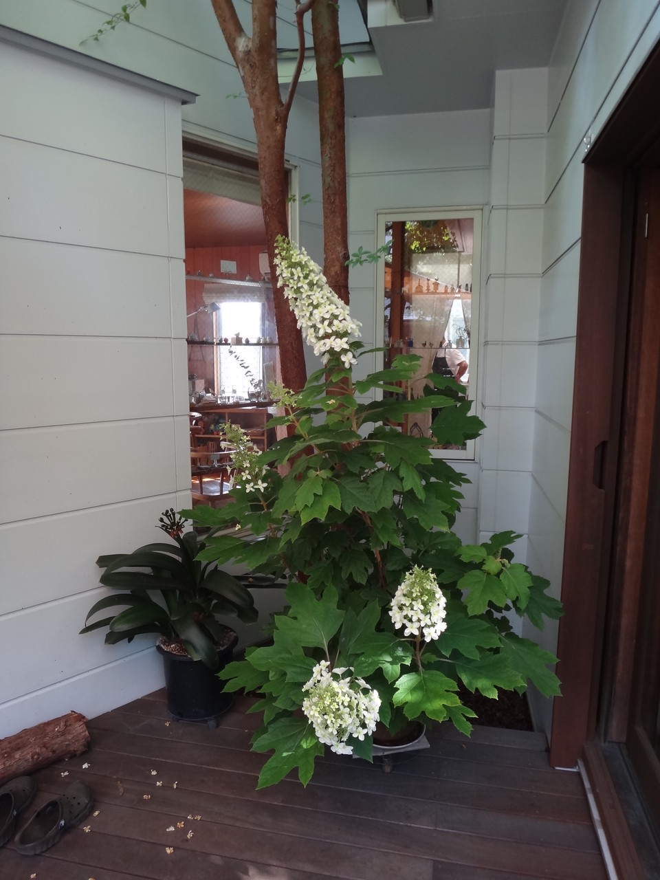 紫陽花は梅雨の頃の花という印象ですが 今年はもう次々と咲き出しました。 カシワバアジサイは巨大な花を咲かせています。 楠の下で咲いている山紫陽花は日本の紫陽花らしく 控え目な印象です。 御近所から頂いた紫陽花は最も紫陽花らしく 青のグラデーションが美しいです。
